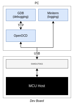 To program, configure, and monitor the system we will be using an ST-LINK debugger/programmer operating over USB. The ST-LINK provides both a debug interface and a USB serial port, the latter of which is used for log messages. The GNU Debugger (GDB) is used for debugging, with OpenOCD providing the interface between the GDB and the hardware, as shown in the diagram below. The ST-link is on board the Nucleo, or on the Morse Micro evaluation kit for standalone Platforms. See Morse Micro IoT Reference Platforms for which USB port to connect to.