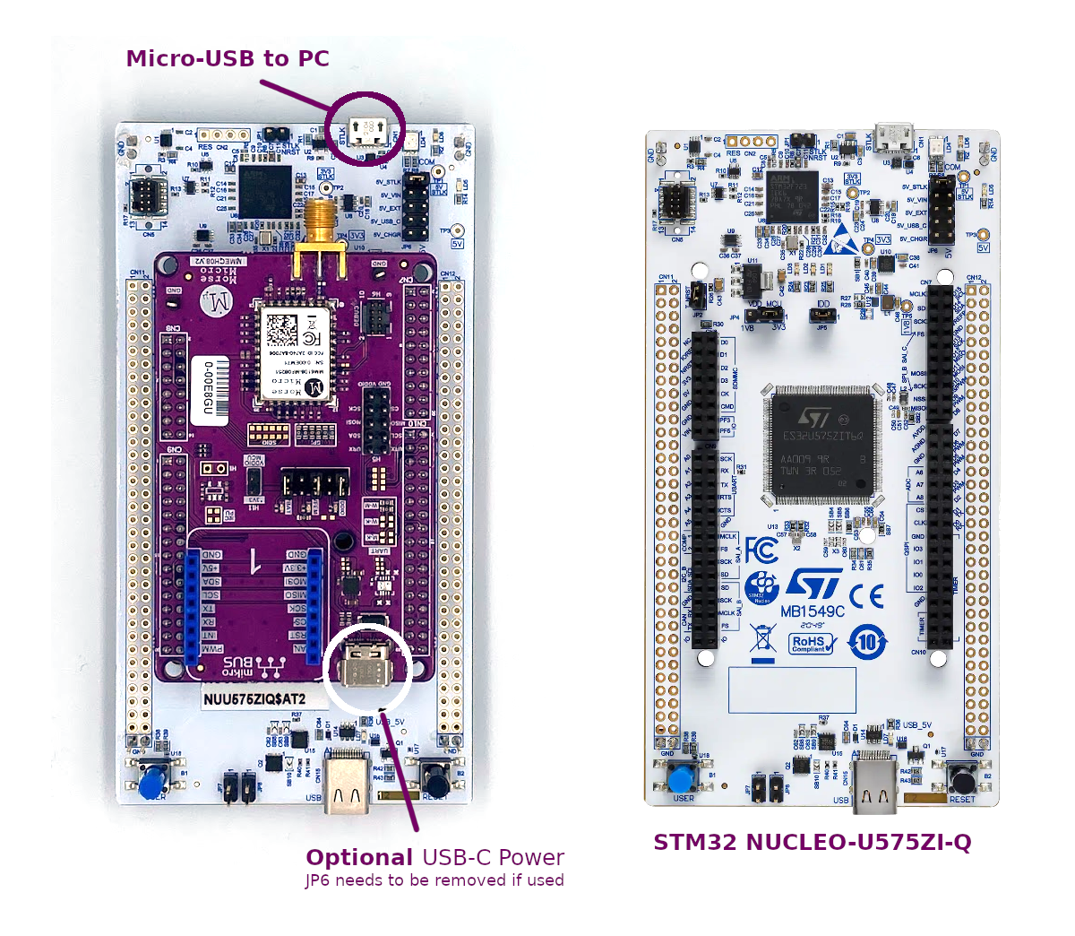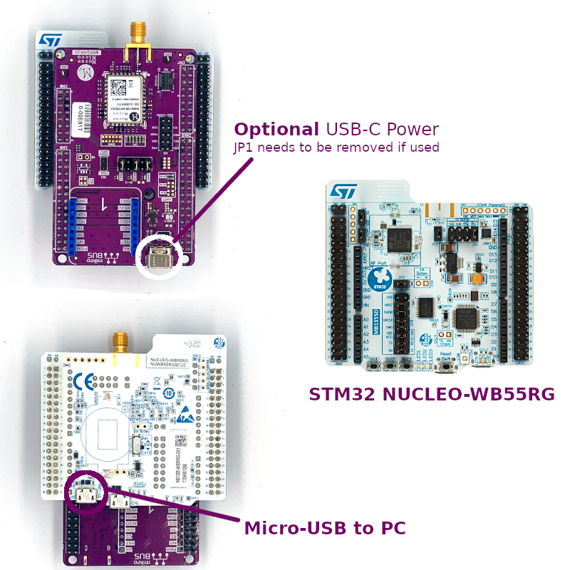 The two boards connect together as shown in the photo below. This is connected to the PC by the micro-USB connector CN15 on the Nucleo, as highlighted below. This will provide power and debug connectivity to the platform.