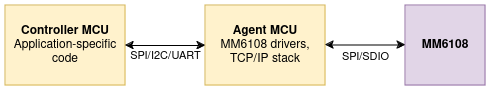 The M2M interface supports a three chip solution, as shown in the diagram below. The Controller is where application-specific code runs and it communicates with the Agent via the M2M interface (e.g., over SPI or UART). The Agent communicates with the Morse transceiver and implements the WLAN drivers and UMAC as well as the network stack. It presents a control API to the Controller via the M2M interface.